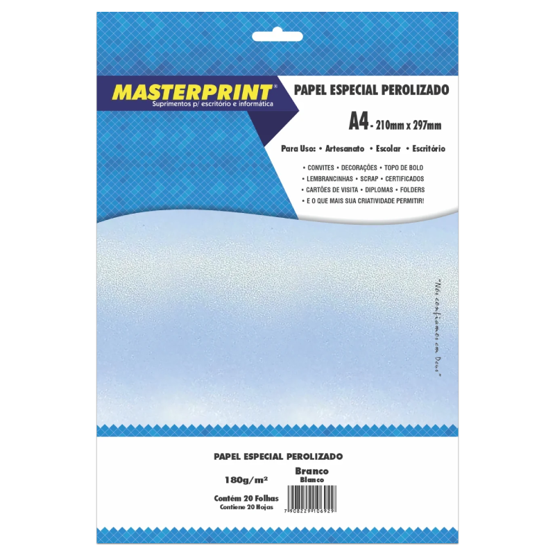 O Papel Perolizado Branco A4 180g Masterprint 20 folhas é indicado para quem busca um acabamento diferenciado e elegante em suas impressões. Sua superfície perolizada proporciona leve brilho e efeito sofisticado, valorizando cores e detalhes. Com gramatura de 180g, oferece rigidez e resistência ideais para convites, certificados, portfólios, cartões e materiais gráficos de alto padrão. O formato A4 garante compatibilidade com impressoras Laser, Inkjet e Offset que aceitem gramaturas de até 180g/m², tornando-o perfeito para projetos criativos e profissionais que exigem acabamento premium e visual refinado.
