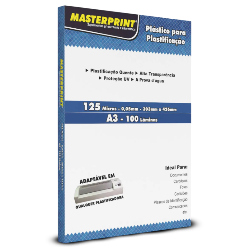 O Plástico para Plastificação 125 Micras 0,05mm 303x426mm Masterprint (100 lâminas) é ideal para proteger documentos, cartazes e materiais em formato maior que o A3, garantindo acabamento profissional e durabilidade. Com espessura de 125 micras (0,05 mm), proporciona flexibilidade e resistência, sendo compatível com plastificadoras térmicas. Cada lâmina possui alta transparência e brilho, destacando o conteúdo plastificado, enquanto a embalagem com 100 unidades assegura praticidade e economia para uso em gráficas, escritórios, escolas e ambientes corporativos.