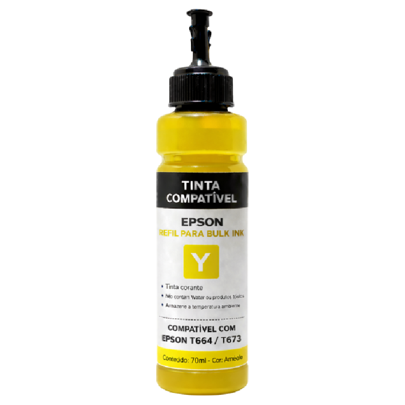 A tinta compatível Epson T664/T673 corante amarelo Bulk Ink 70 ml é um refil de tinta de alta qualidade desenvolvido para sistemas de Bulk Ink em impressoras Epson que utilizam essas linhas, oferecendo preto profundo, excelente definição de texto e ótima fluidez para impressão de documentos e imagens; com 70 ml, proporciona bom rendimento de páginas, secagem rápida e ótimo custo-benefício para uso doméstico, escolar ou em pequenos escritórios.